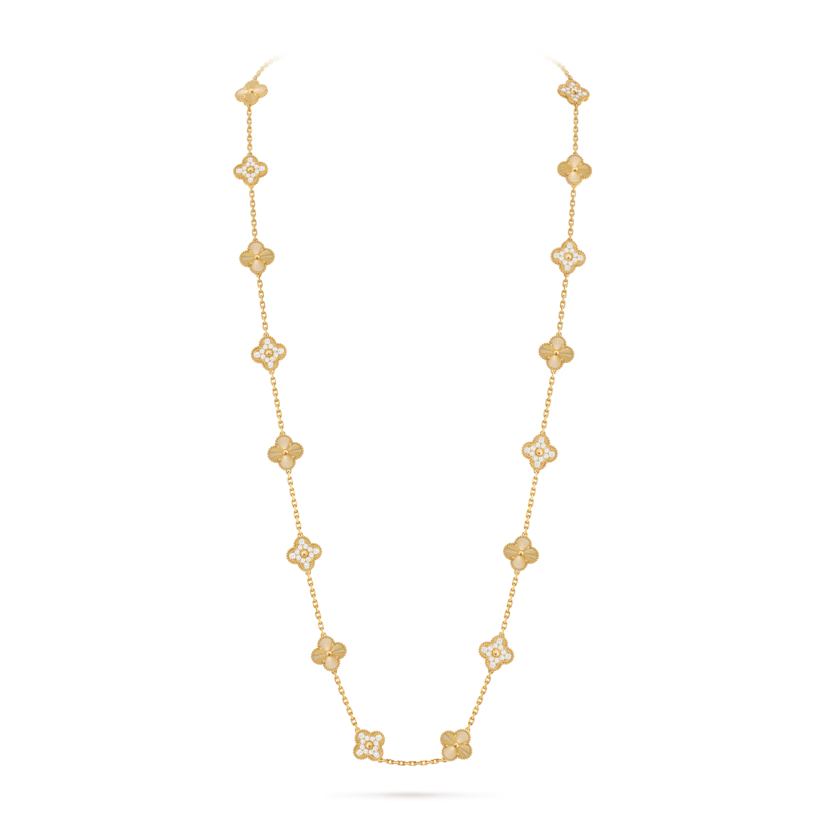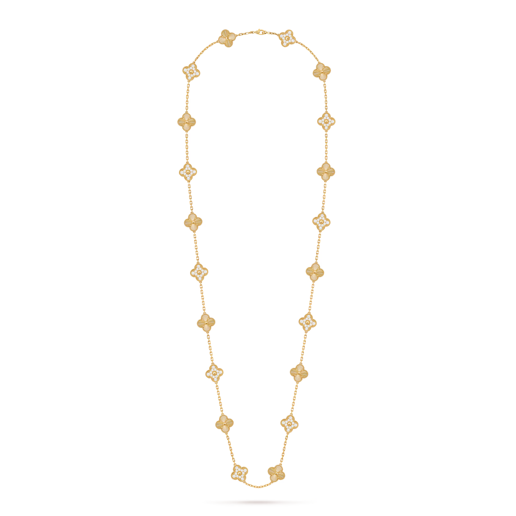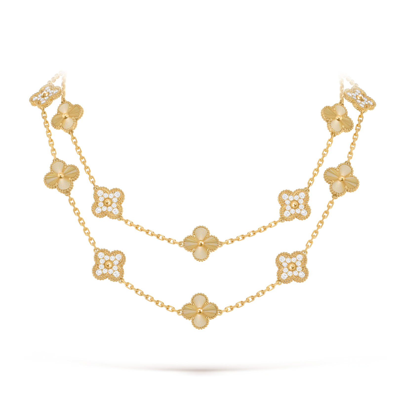 Crafted in guilloché 18K yellow gold, this Vintage Alhambra long necklace features twenty iconic clover motifs accented with sparkling round diamonds, offering exceptional brilliance and timeless elegance.