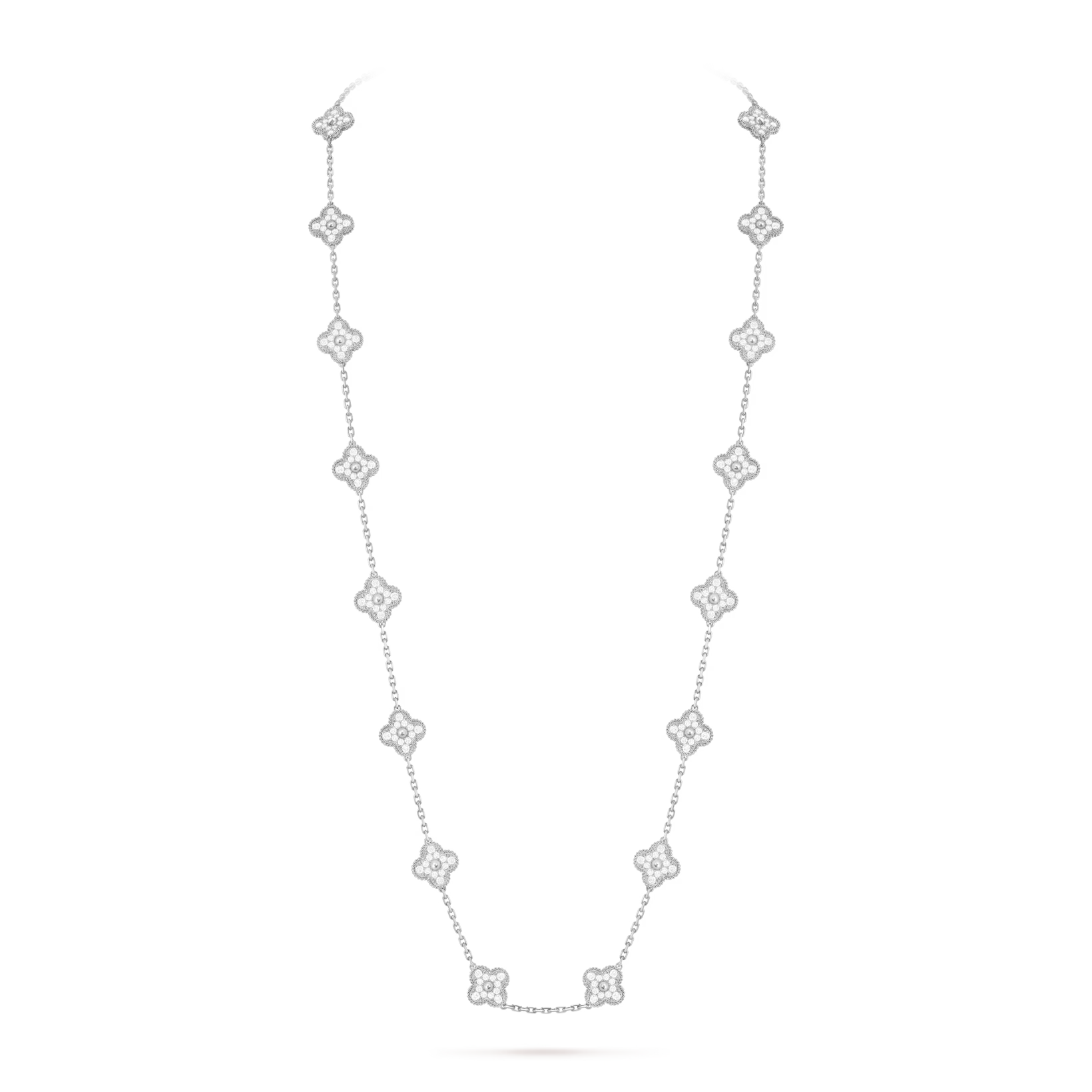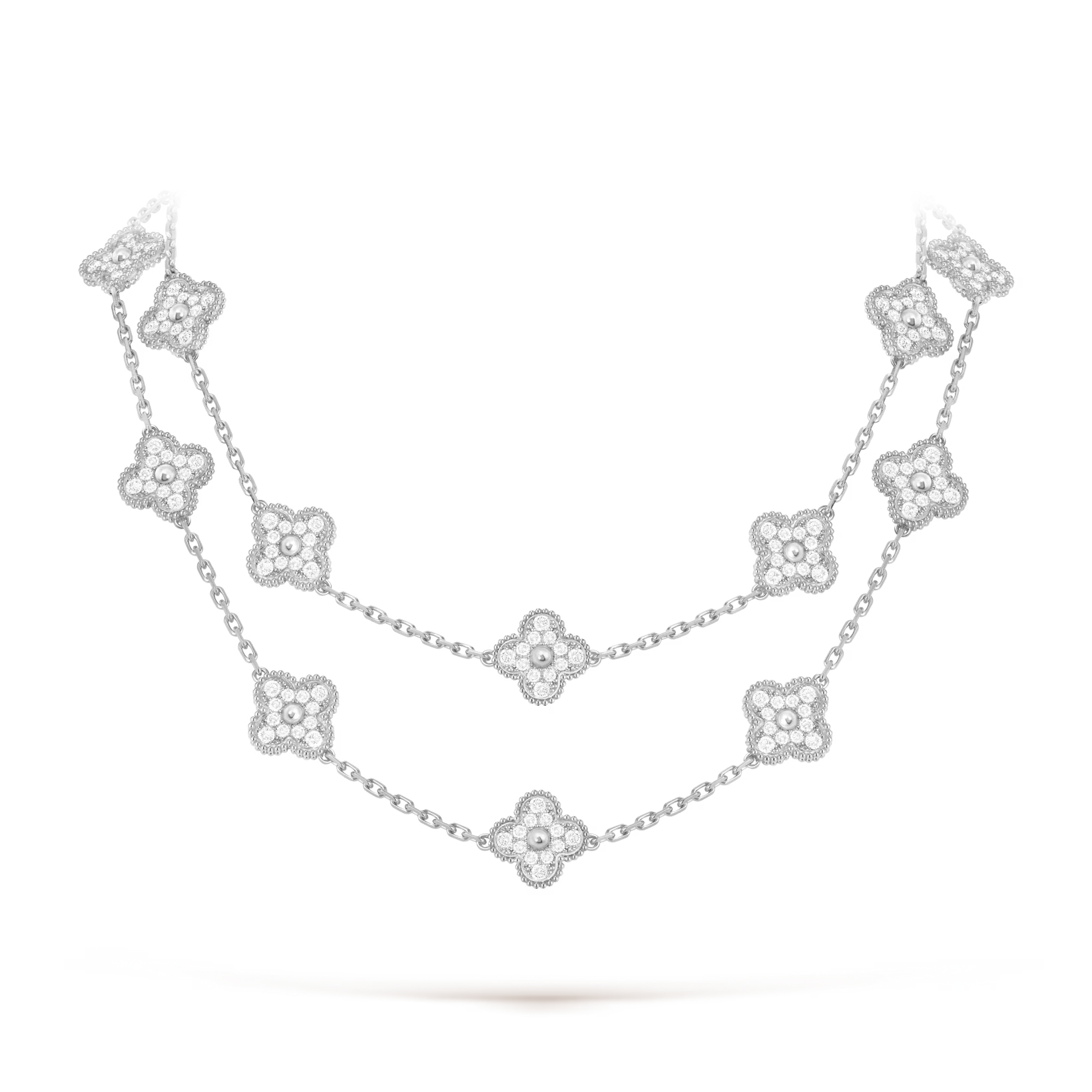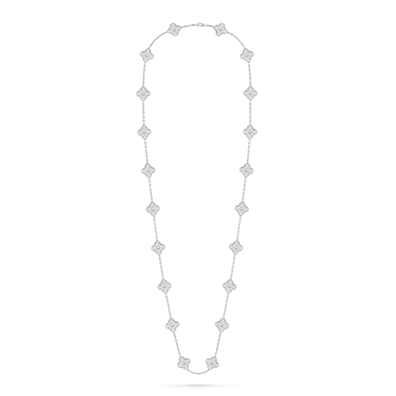 Vintage Alhambra long necklace, 20 motifs, rhodium plated 18K white gold, round diamonds