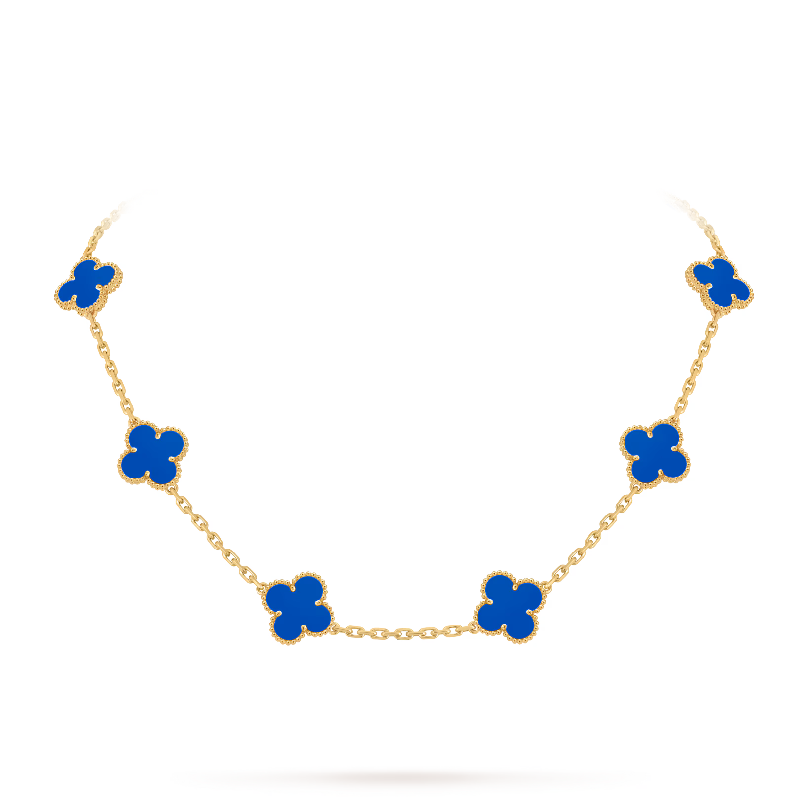 Crafted in 18K yellow gold, this Vintage Alhambra necklace features ten striking blue agate clover motifs, adding a vibrant and elegant touch.