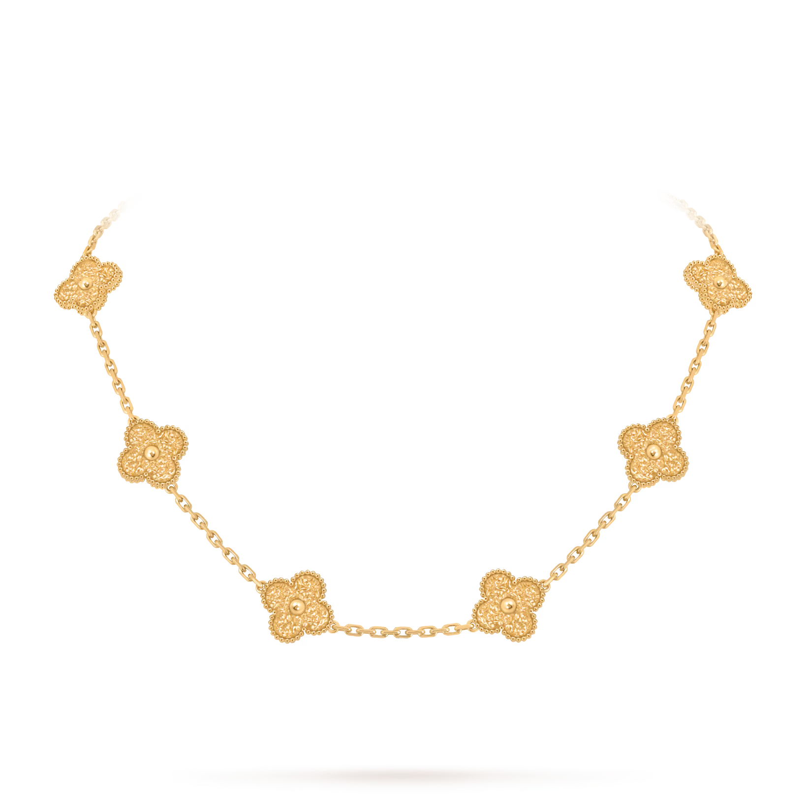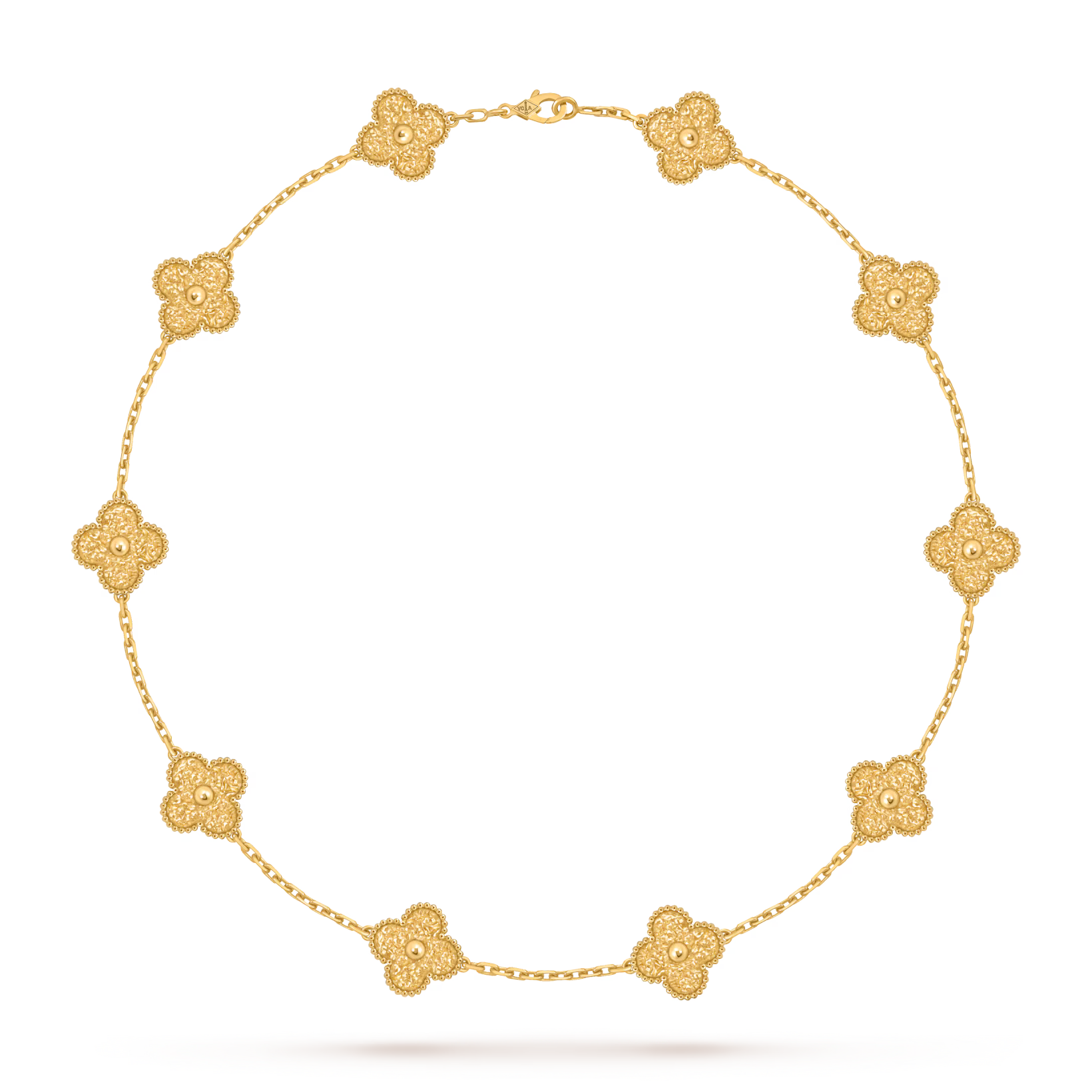 Crafted in textured 18K yellow gold, this Vintage Alhambra necklace features ten iconic clover motifs with intricate beaded detailing for a rich and timeless look.