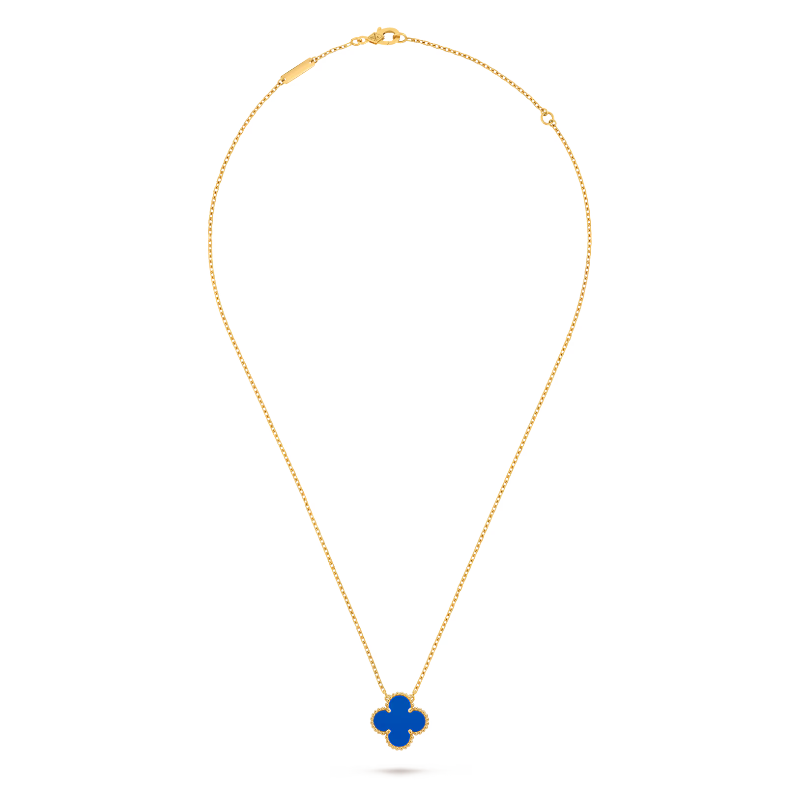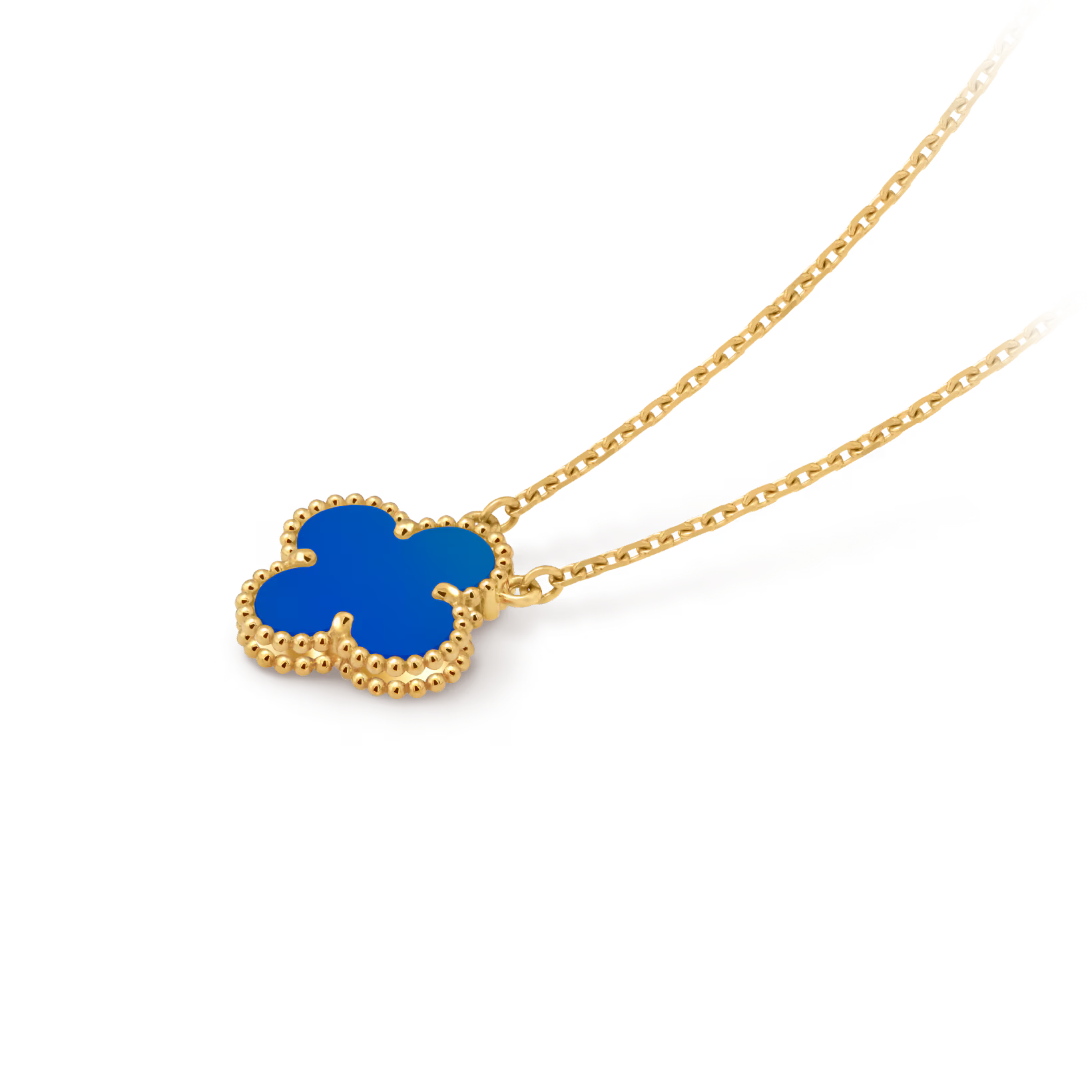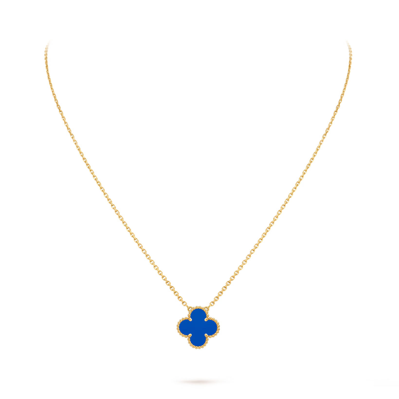 Crafted in 18K yellow gold, this Vintage Alhambra pendant features a single clover motif in striking blue agate, adding a vibrant and elegant touch.