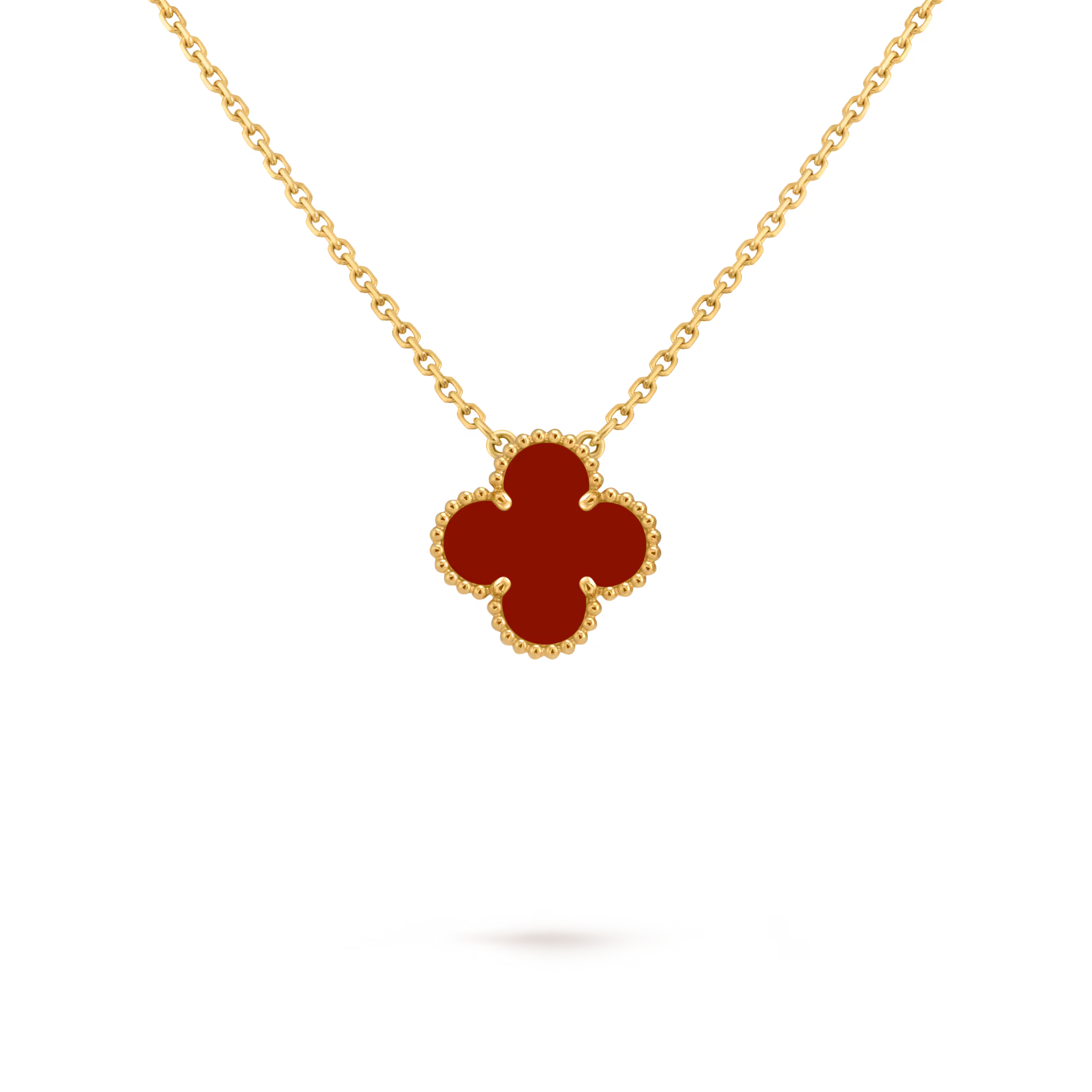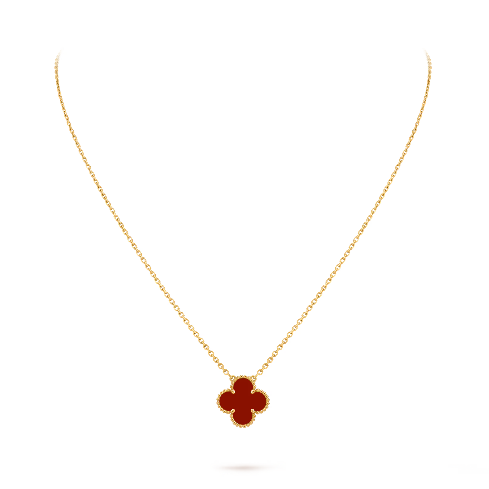 Crafted in 18K yellow gold, this Vintage Alhambra pendant features a single vibrant carnelian clover motif, radiating warmth and timeless elegance.
