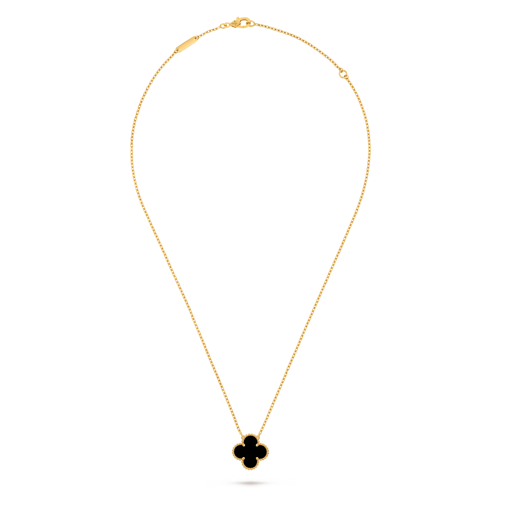 Crafted in 18K yellow gold, this Vintage Alhambra pendant features a single deep black onyx clover motif, elegantly attached to its chain for a timeless and refined look.