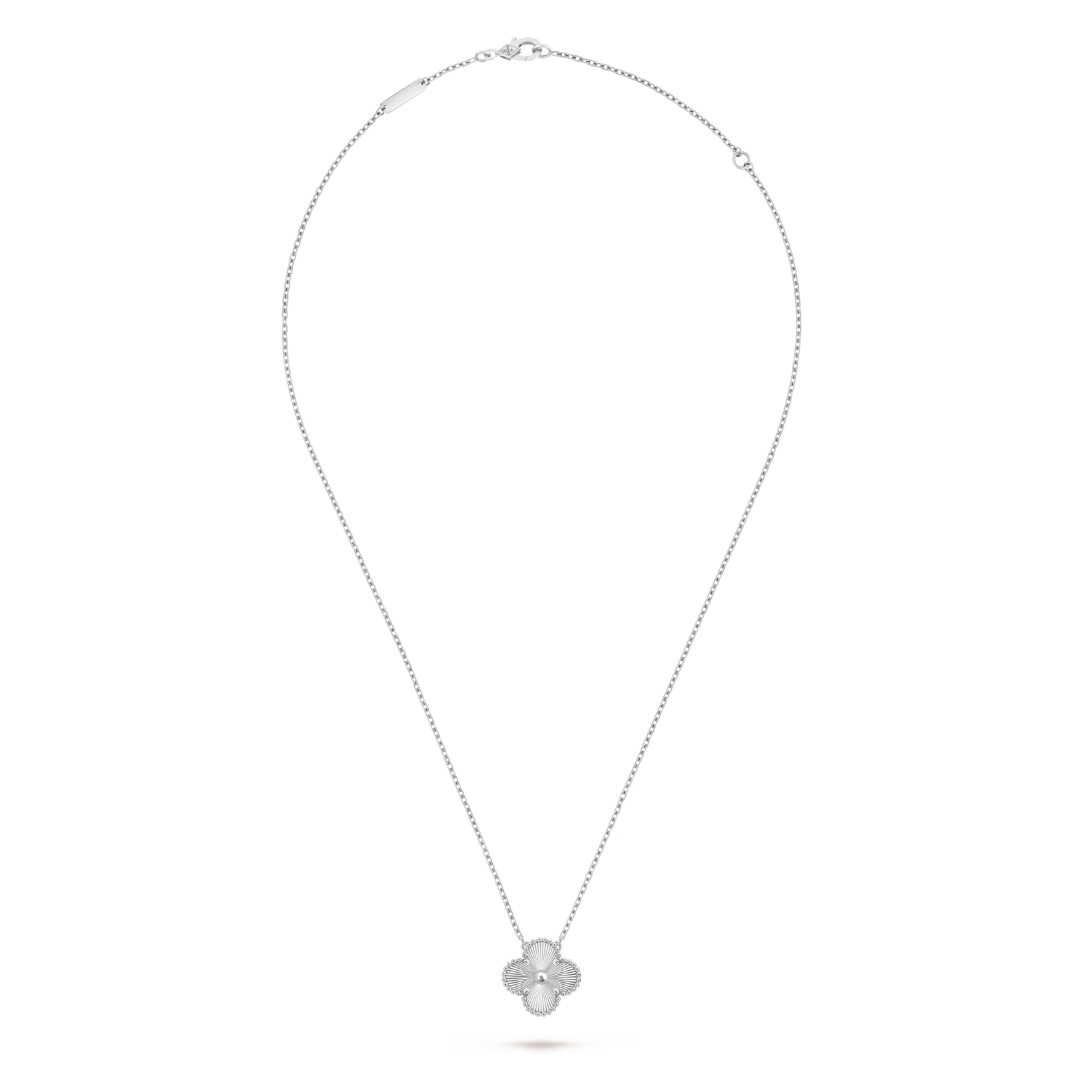 Crafted in guilloché rhodium-plated 18K white gold, this Vintage Alhambra pendant features a single clover motif with radiant sunburst detailing for a luminous and refined look.