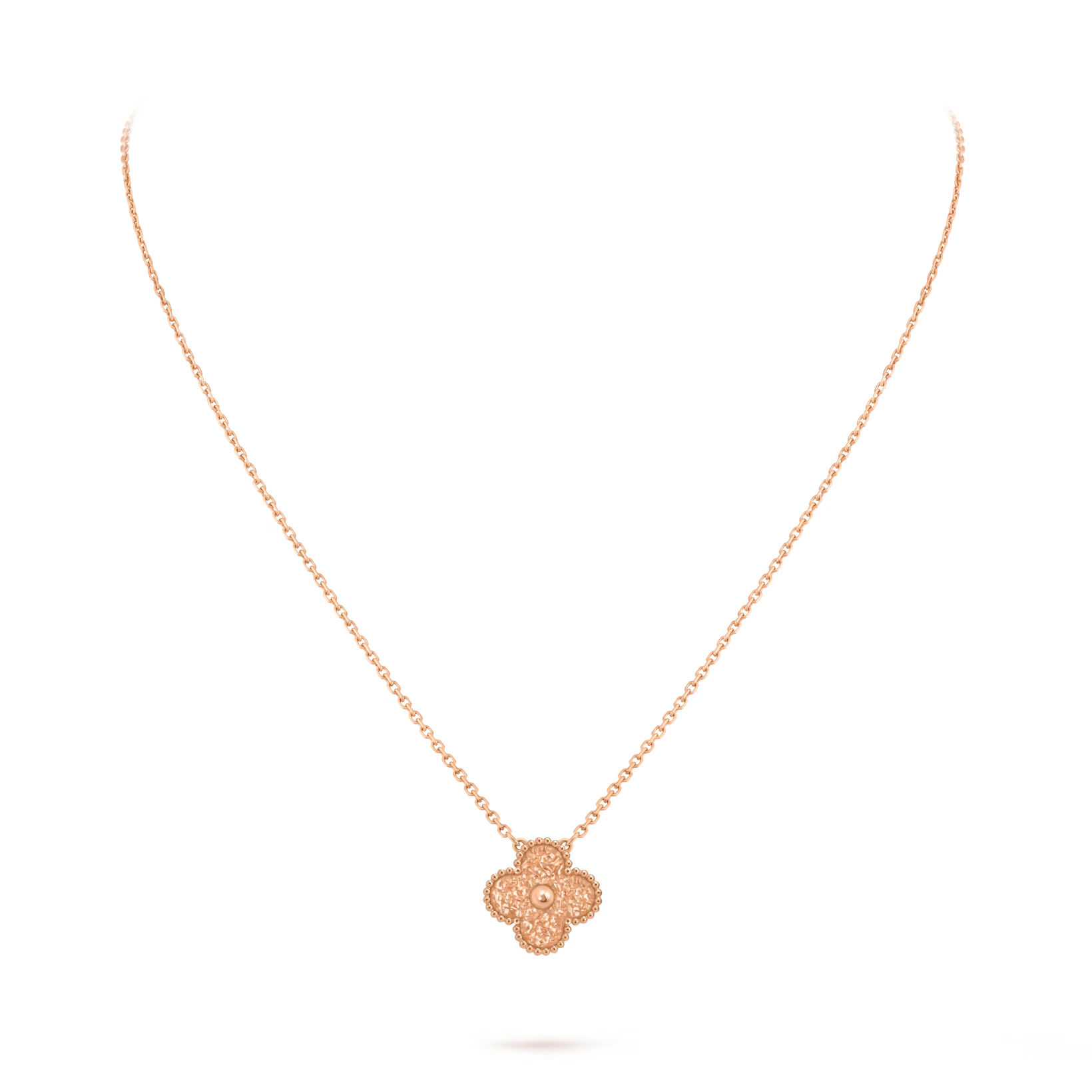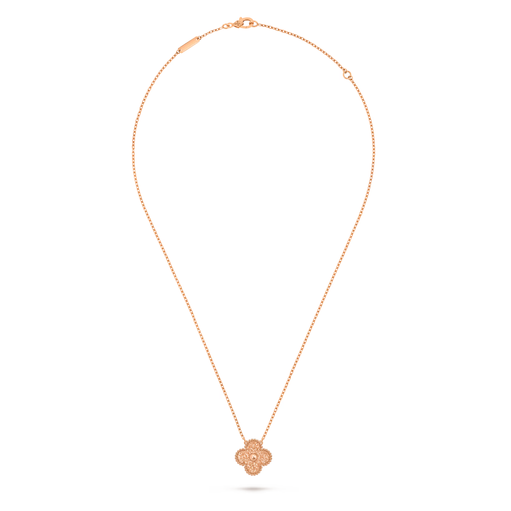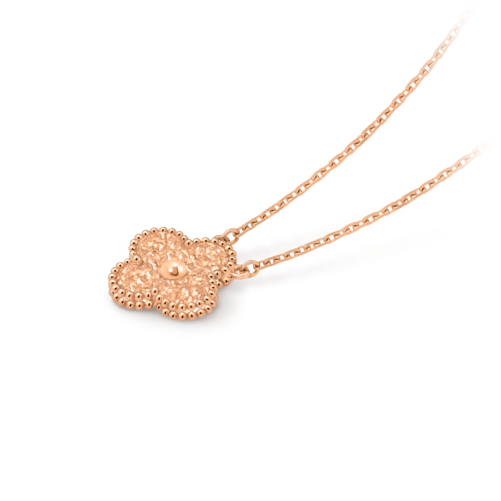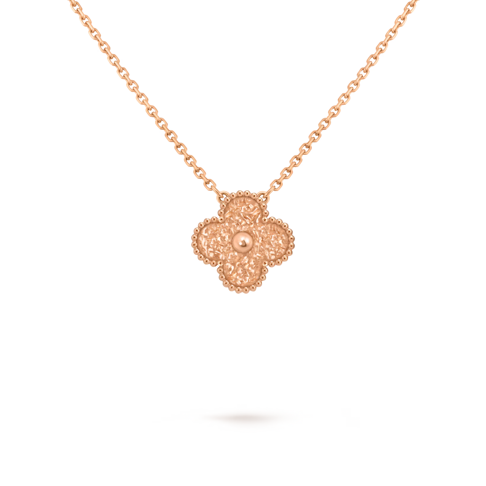 Crafted in textured 18K rose gold, this Vintage Alhambra pendant features a single clover motif with intricate beaded detailing for a warm and timeless look. If you have any questions, please contact us on WhatsApp.