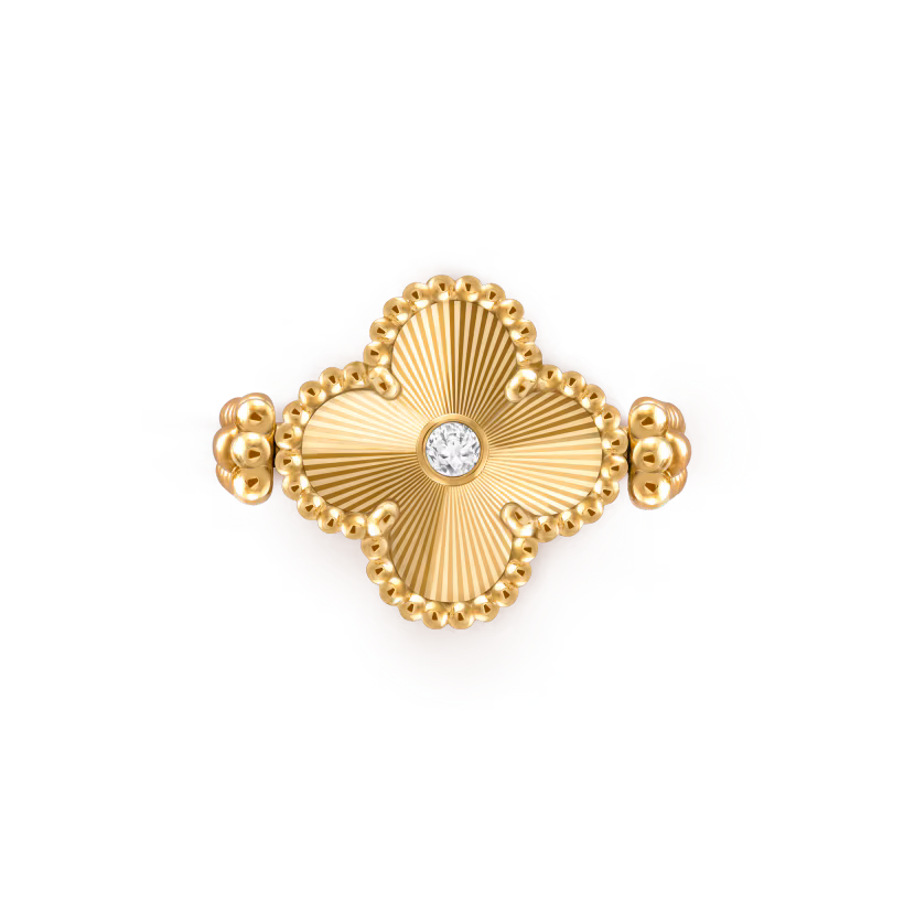 Crafted in guilloché 18K yellow gold, this Vintage Alhambra reversible ring showcases a clover motif with blue agate on one side and a sparkling diamond on the other, offering two elegant looks in one design.