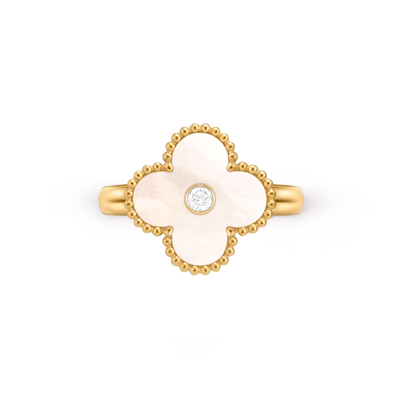 Vintage Alhambra ring, 18K yellow gold, white mother-of-pearl, round diamond