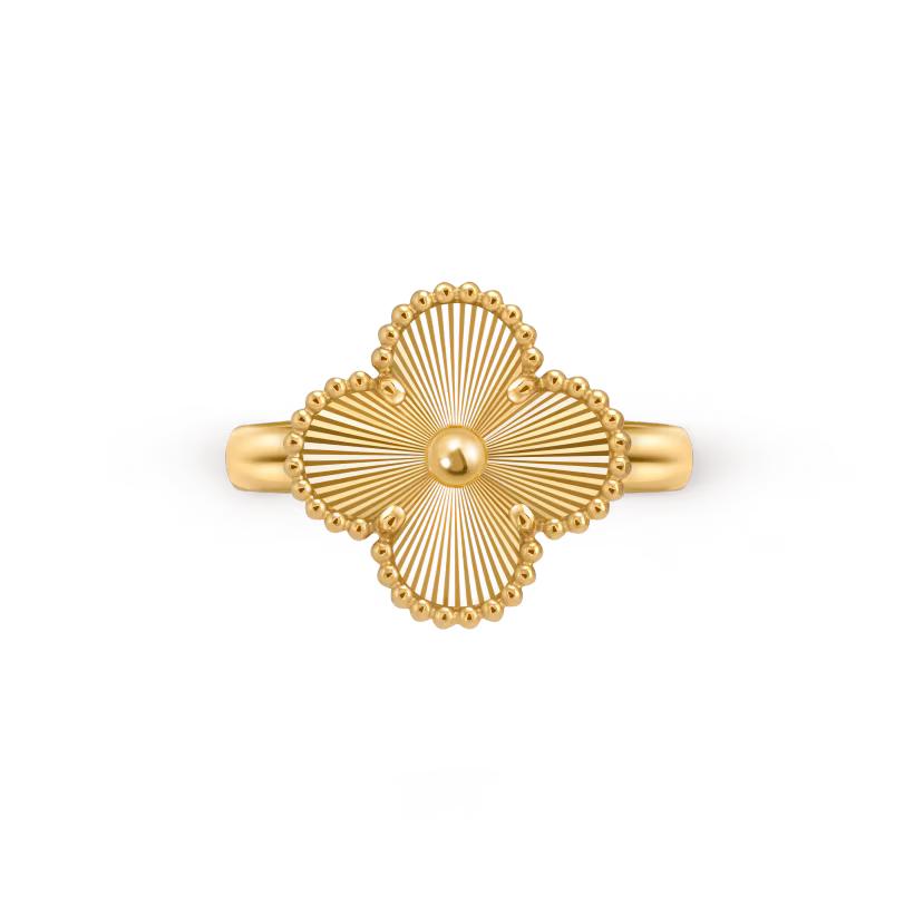 Crafted in guilloché 18K yellow gold, this Vintage Alhambra ring features a single clover motif with radiant sunburst detailing for a luminous and timeless look.