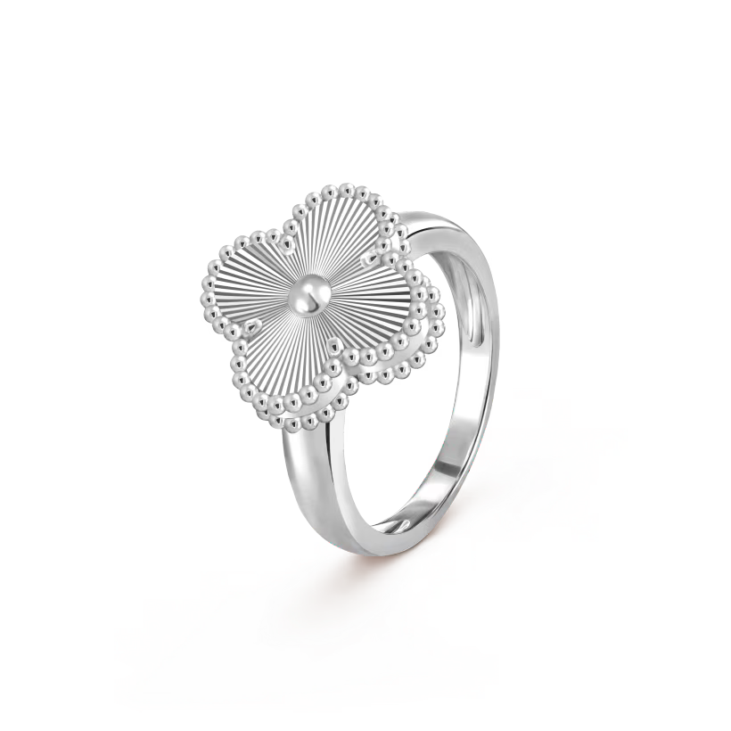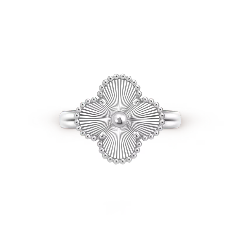 Crafted in guilloché rhodium-plated 18K white gold, this Vintage Alhambra ring features a clover motif with radiant sunburst detailing for a luminous and refined look.