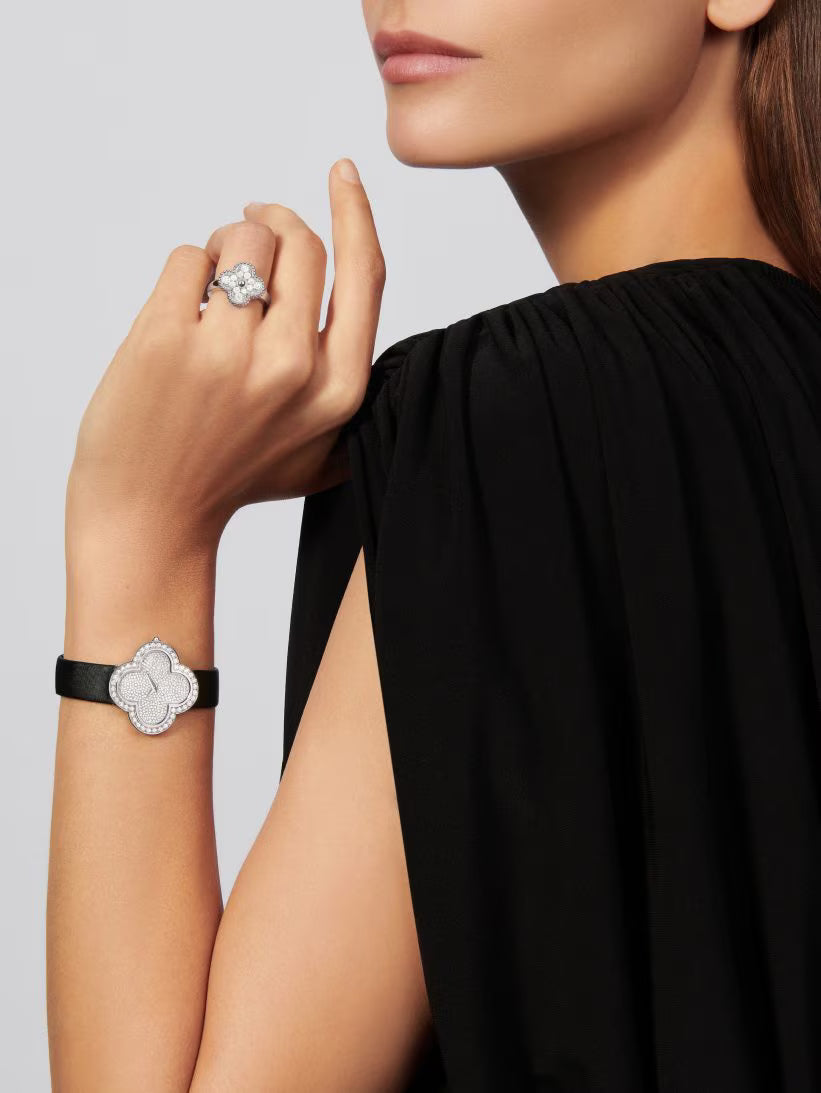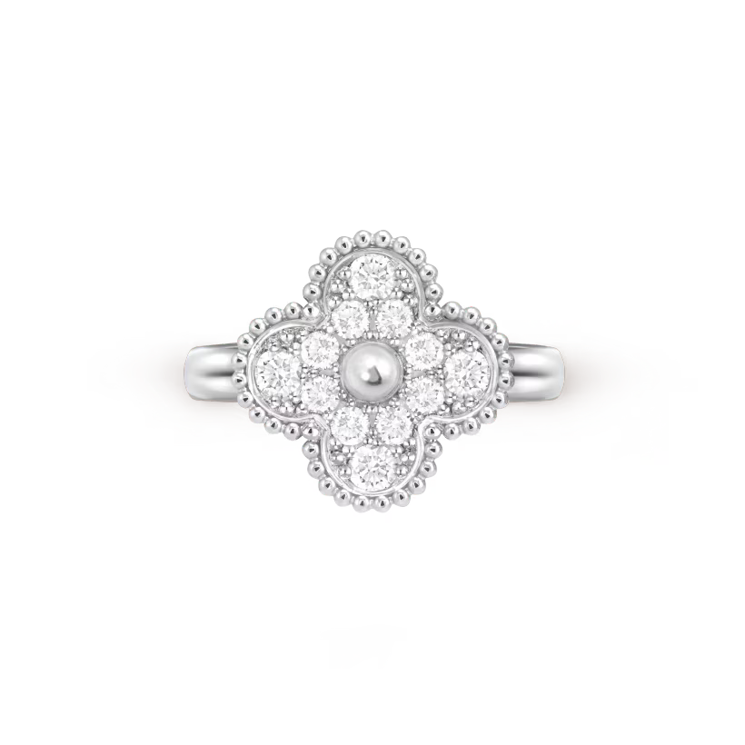 Vintage Alhambra ring, rhodium plated 18K white gold, round diamonds