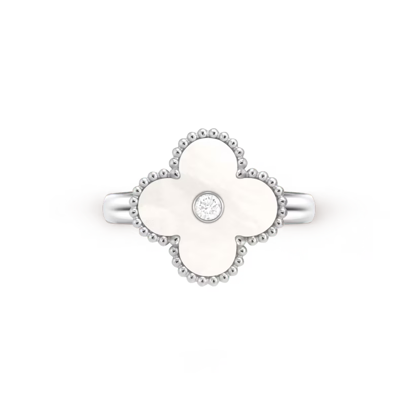 Crafted in rhodium-plated 18K white gold, this Vintage Alhambra ring features a luminous white mother-of-pearl clover motif accented with a sparkling round diamond for timeless elegance.