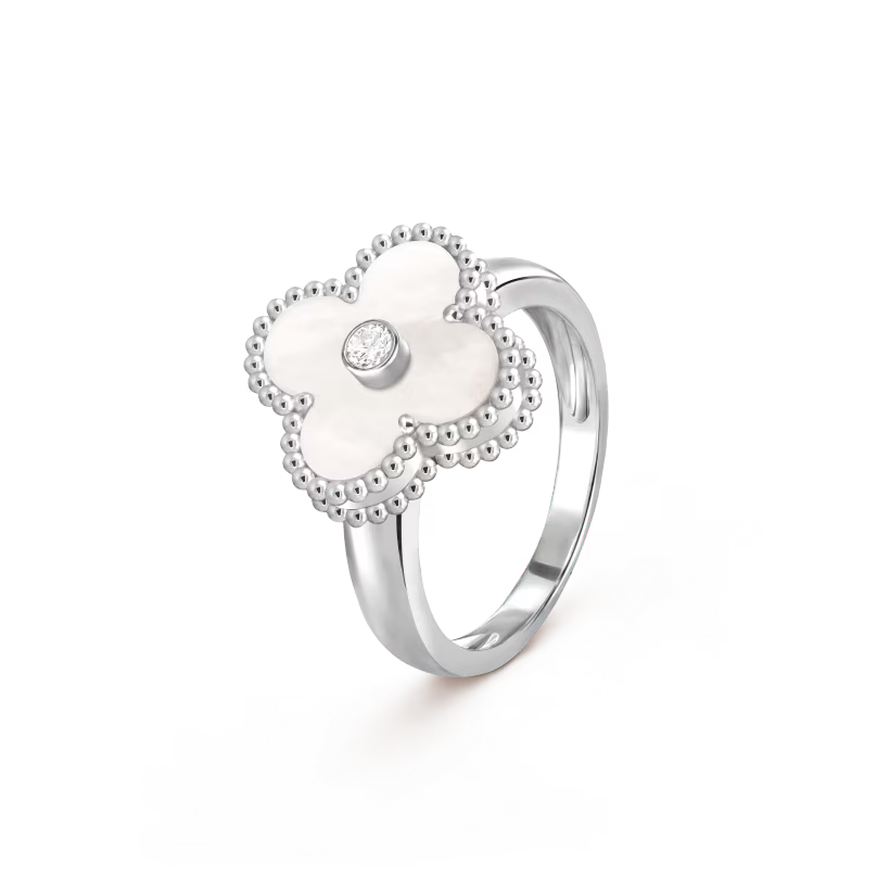 Vintage Alhambra ring, rhodium plated 18K white gold, white mother-of-pearl, round diamond